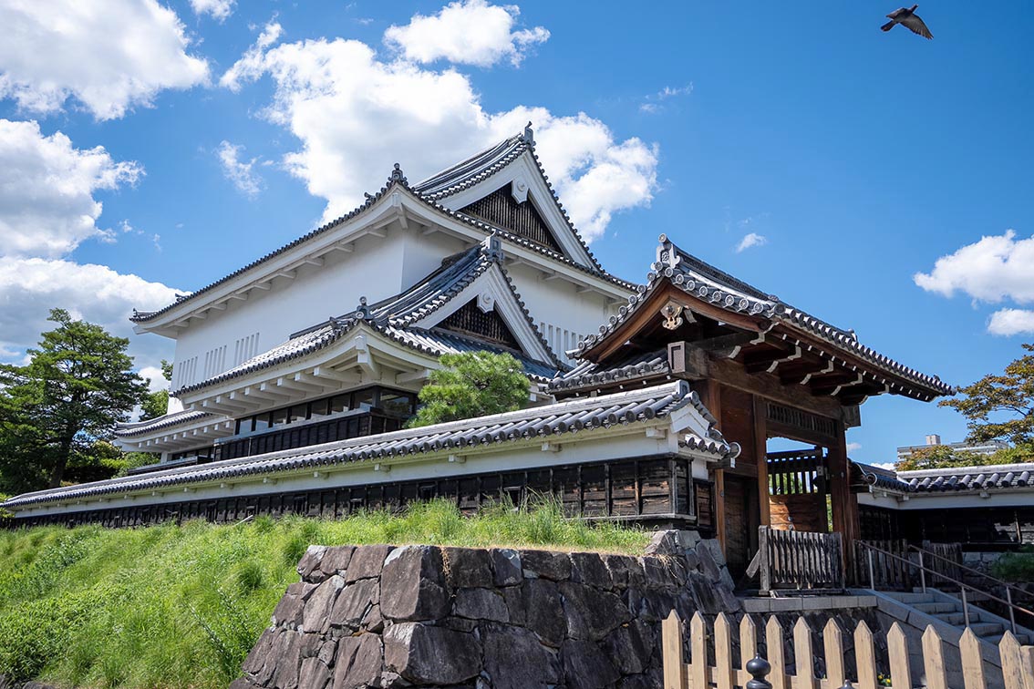 The Shoryuji Castle Park in Nagaokakyo is built on the site of a castle that was linked to several historical figures and important events in sixteenth-century Japan. Shoryuji Castle was the newlywed home of the warlord Hosokawa Tadaoki (1563–1646) and Hosokawa Gracia (1563–1600). The story of Gracia’s romance, conversion to Christianity, and tragic death have made her a beloved figure that has been featured in novels, television dramas, movies, and video games. The city park at the former castle site is surrounded by a moat and castle walls with turrets. The grounds contain a strolling garden and a keep-like structure with an exhibition space where visitors can learn about Shoryuji Castle and its former inhabitants.